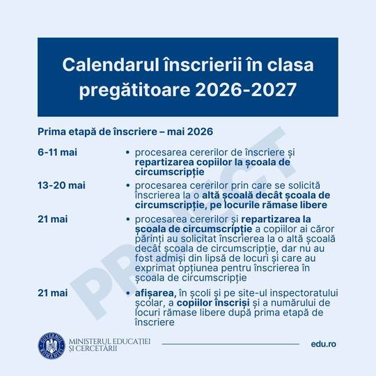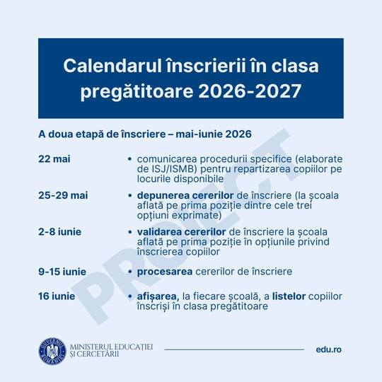 A doua etapă ar urma să se desfășoare între 22 mai și 16 iunie 2026. În acest interval, părinții vor putea depune cereri de înscriere la școala aflată pe prima opțiune dintre cele exprimate, între 25 și 29 mai.