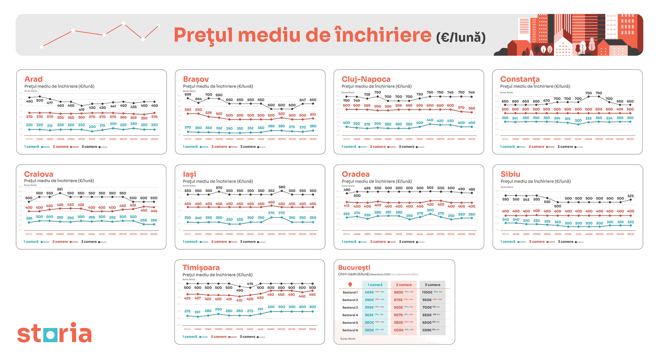 Luna decembrie 2025 a adus ajustări moderate pe piața chiriilor din marile orașe ale țării, potrivit analizei realizate de platforma imobiliară Storia. Evoluțiile diferă de la un oraș la altul: în aproximativ jumătate dintre orașele analizate, prețurile medii ale chiriilor s-au menținut la același nivel sau au fost mai mici comparativ cu decembrie 2024, în timp ce în sudul și vestul țării au fost înregistrate creșteri punctuale.