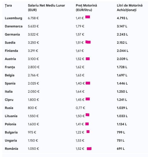 Prin comparație, un luxemburghez poate cumpăra aproape 4.800 litri, un danez peste 3.100 litri, iar un german peste 2.200 litri. Chiar și vecinii din Polonia (1.134 litri) și Bulgaria (799 litri) se află înaintea României, ceea ce evidențiază decalajul puterii de cumpărare.