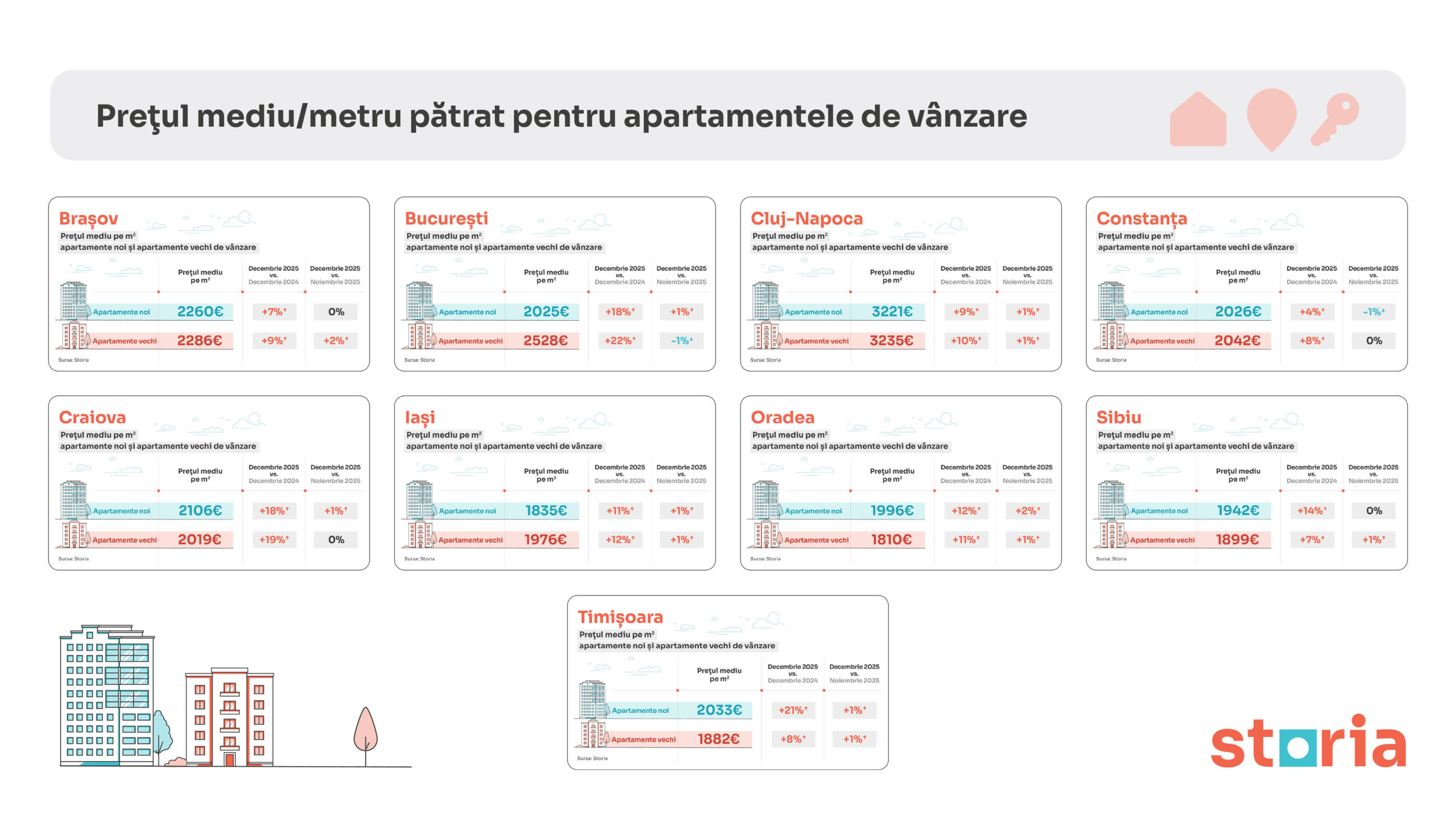 Deși Bucureștiul a înregistrat cea mai mare creștere procentuală, Cluj-Napoca continuă să fie orașul cu cele mai ridicate prețuri medii, 3.228 euro/mp în decembrie 2025, marcând o creștere de 9,4% față de decembrie 2024.