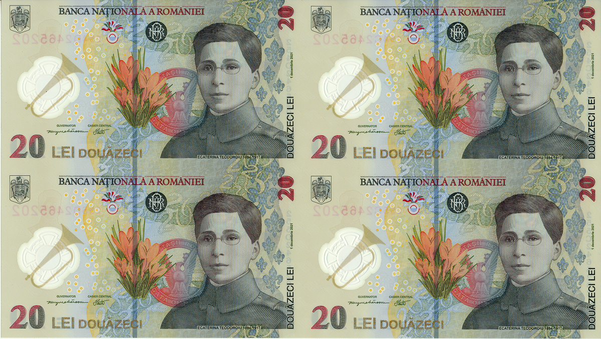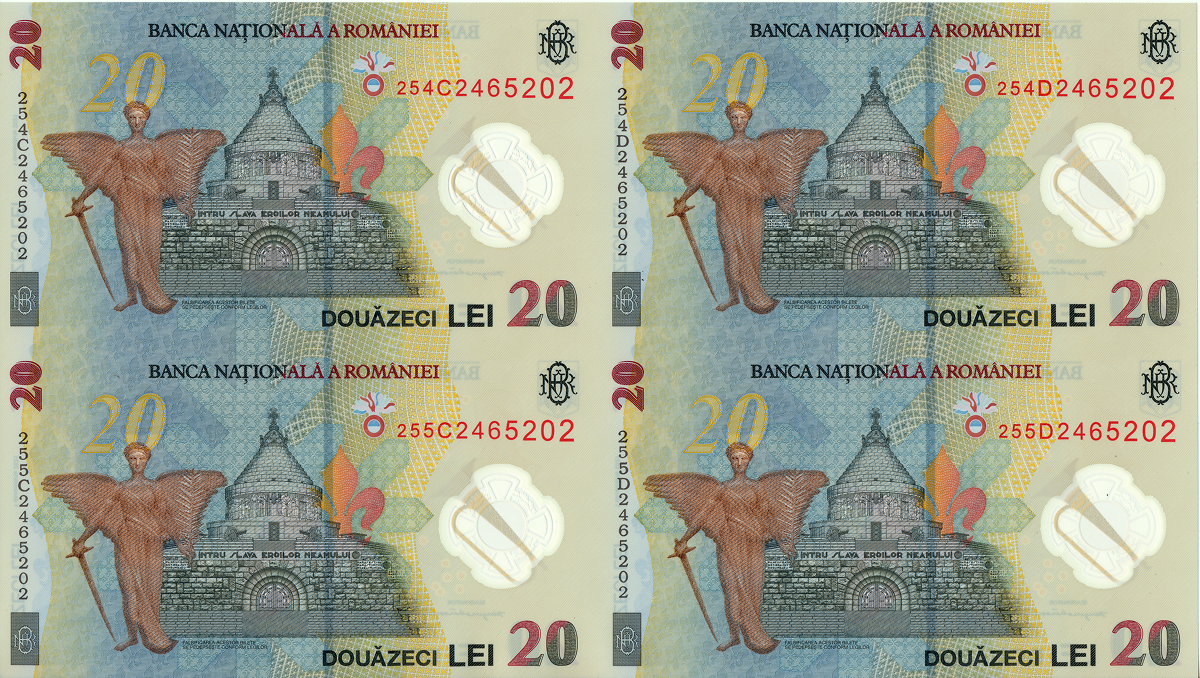 SURSA FOTO: BNR/Lansare coală numismatică,formată din 4 bancnote de 20 de lei – Prezentare față