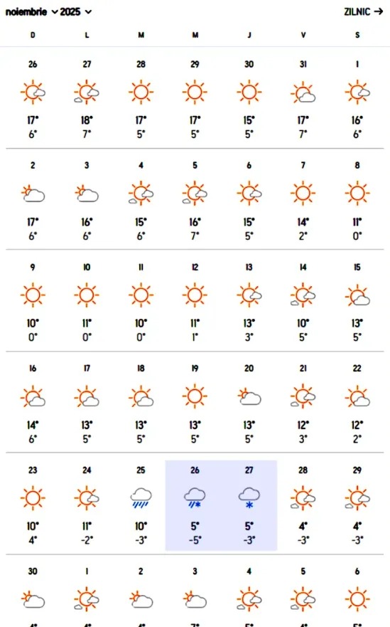 Astfel, noiembrie se anunță o lună rece, cu ninsori, temperaturi moderate și soare mai timid. Primele ninsori în Capitală sunt prognozate pentru 26 și 27 noiembrie 2025, iar momentul nu este departe.