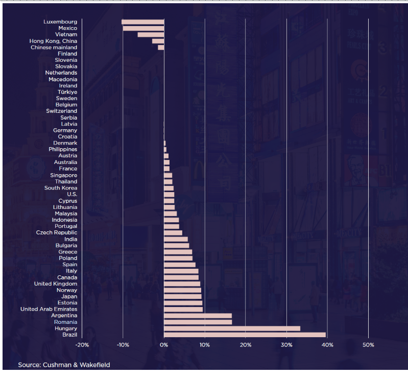 Raportul Cushman & Wakefield analizează chiriile headline în 141 de locații urbane de top din întreaga lume, majoritatea asociate cu sectorul de lux. La nivel global, chiriile au crescut în medie cu 4,2%, 58% dintre piețe raportând majorări. În Europa, creșterea medie a fost de 4%, cu performanțe remarcabile în Budapesta și Londra, în timp ce Asia-Pacific a înregistrat un avans moderat de 2,1%, impactat de provocările economice din China și Asia de Sud-Est.