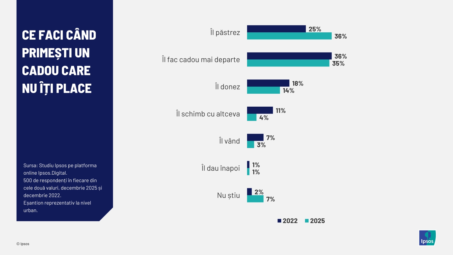 Întrebați, la o distanță de 3 ani, ce vor face cu cadourile primite care nu le plac, 36% dintre respondenții din mediul urban spun anul acesta că le vor păstra totuși, o creștere substanțială față de procentul de 25% înregistrat în 2022. Anul acesta, păstrarea cadoului este la egalitate cu oferirea cadoului mai departe, care a trecut pe locul secund cu 35%. Celelalte opțiuni sunt în scădere față de 2022: intenția de a schimba produsul a coborât semnificativ la 4% (față de 11%), donarea acestuia a scăzut la 14% (de la 18%), iar vânzarea cadourilor considerate nepotrivite este preferată de doar 3% dintre persoane (comparativ cu 7%). Returnarea cadoului către cel care l-a oferit rămâne un gest evitat constant, menținându-se la un prag marginal de 1% în ambii ani analizați.