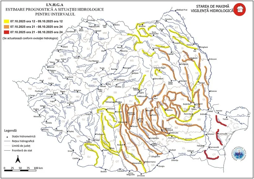 În paralel, Institutul Național de Hidrologie și Gospodărire a Apelor (INHGA) a actualizat avertizarea hidrologică, anunțând Cod Roșu de inundații pentru râurile din județele Constanța și Tulcea, valabil din seara zilei de marți până miercuri noapte.