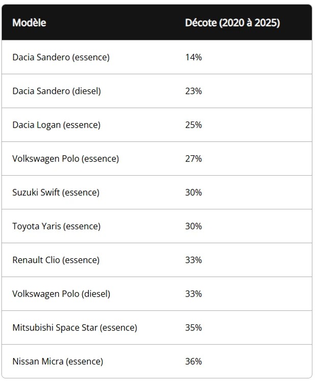Studiul a comparat deprecierea vehiculelor bugetare, premium și electrice pe o perioadă de cinci ani, raportând prețul mediu second-hand la prețul „mediu” de nou în 2020 pentru aceeași gamă. Modelele Dacia accesibile domină topul, însă, în spatele lor, numeroase modele străine depășesc mașinile franceze, care se confruntă cu dificultăți în menținerea valorii. Această tendință nu este surprinzătoare: mașinile de oraș de la Peugeot, Citroën și Renault sunt atât de răspândite încât păstrarea valorii lor devine mai dificilă, mai ales în comparație cu vehiculele cu o reputație mai solidă, în special în ceea ce privește fiabilitatea.