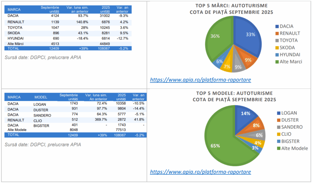 În luna septembrie 2025, Dacia a menținut poziția de lider pe piața autoturismelor noi, cu 4.124 vehicule vândute, însă comparativ cu aceeași lună a anului trecut, cifra reprezintă o scădere de 9,3%. Pe locurile următoare s-au situat Renault, cu 1.139 modele (+4,2%), și Toyota, cu 1.047 unități (+3,6%).