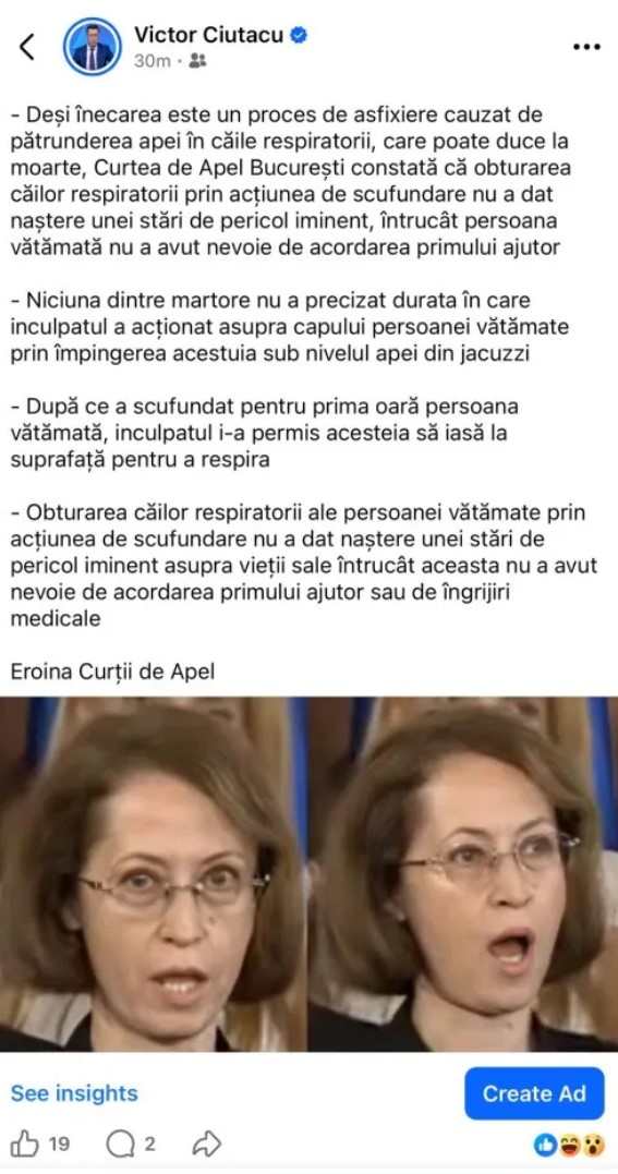 Potrivit explicațiilor din motivarea instanței, citate de Ciutacu în analiză, judecătorii au apreciat că obturarea căilor respiratorii prin scufundare nu a generat o stare de pericol iminent pentru viața victimei. Instanța a reținut și faptul că nu a putut fi stabilită cu precizie durata asfixierii, martorii neindicând intervale clare.