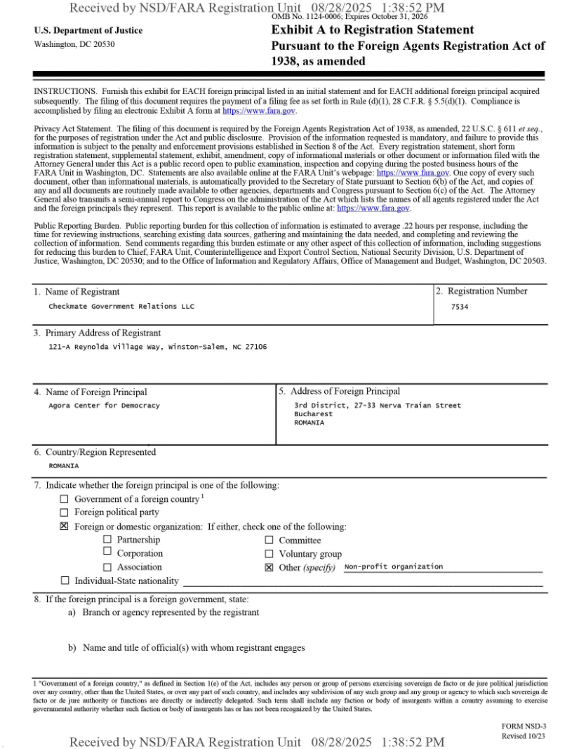 Scopul contractului? Unul politic, evident. Asigurarea de lobby la nivelul Guvernului SUA si la persoane din Administratia Trump pentru ONG-ul Agora Center for Democracy.
