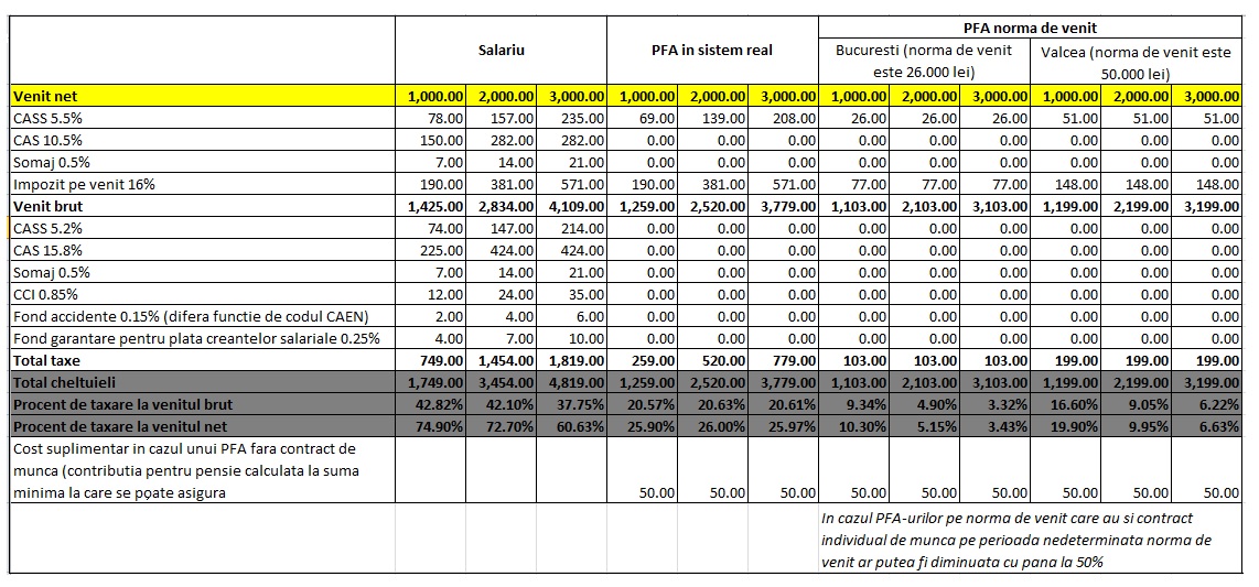 Un PFA trebuie să plătească impozitul pe venit de 16%, contribuţia de asigurări de sănătate (CASS) de 5,5% la venitul net precum şi contribuţia de asigurări sociale (CAS) de 26,3% din venitul pentru care se încheie contractul de asigurare. În cazul în care au si alte venituri din salarii,eventual un contract de munca pe timp partial la care totalul taxelor nu depaseste 110 Ron , PFA sunt exceptate de la plata contribuţiei la pensii (CAS).