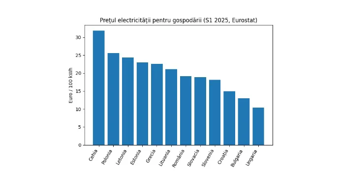 În Europa de Est, prețurile la electricitate variază semnificativ de la o țară la alta. Conform acelorași date Eurostat, prețurile finale pentru gospodării în S1 2025 au fost: