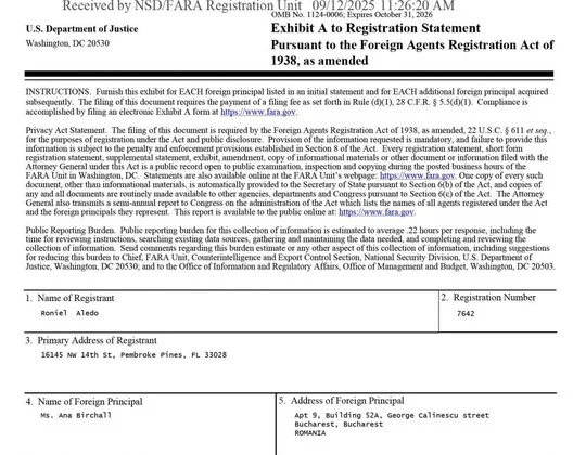 Roniel Aledo a depus declarații privind relația sa cu Birchall, în baza Foreign Agents Registration Act, documentele fiind datate 11 septembrie 2025 și înregistrate și publicate pe 12 septembrie.