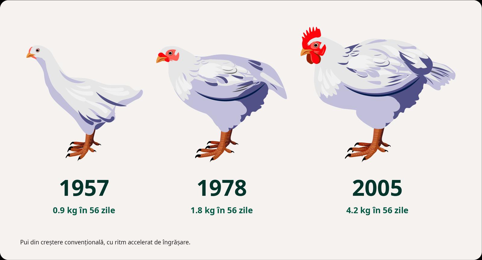 Aceste păsări, cunoscute în industrie sub numele de “pui broiler”, sunt cele mai numeroase animale de fermă din lume.