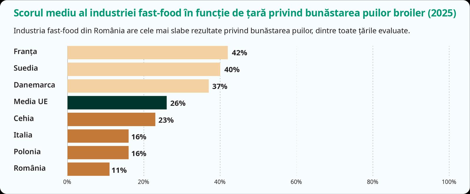 În timp ce scorul mediu al țărilor europene pentru bunăstarea păsărilor a crescut la 26% în 2025, față de 22% în 2024, rezultatele din România înregistrează o scădere îngrijorătoare. Scorul mediu al industriei a scăzut la 11% în 2025, de la 17% în 2023, ceea ce face ca România să fie piața cu cel mai mic scor.