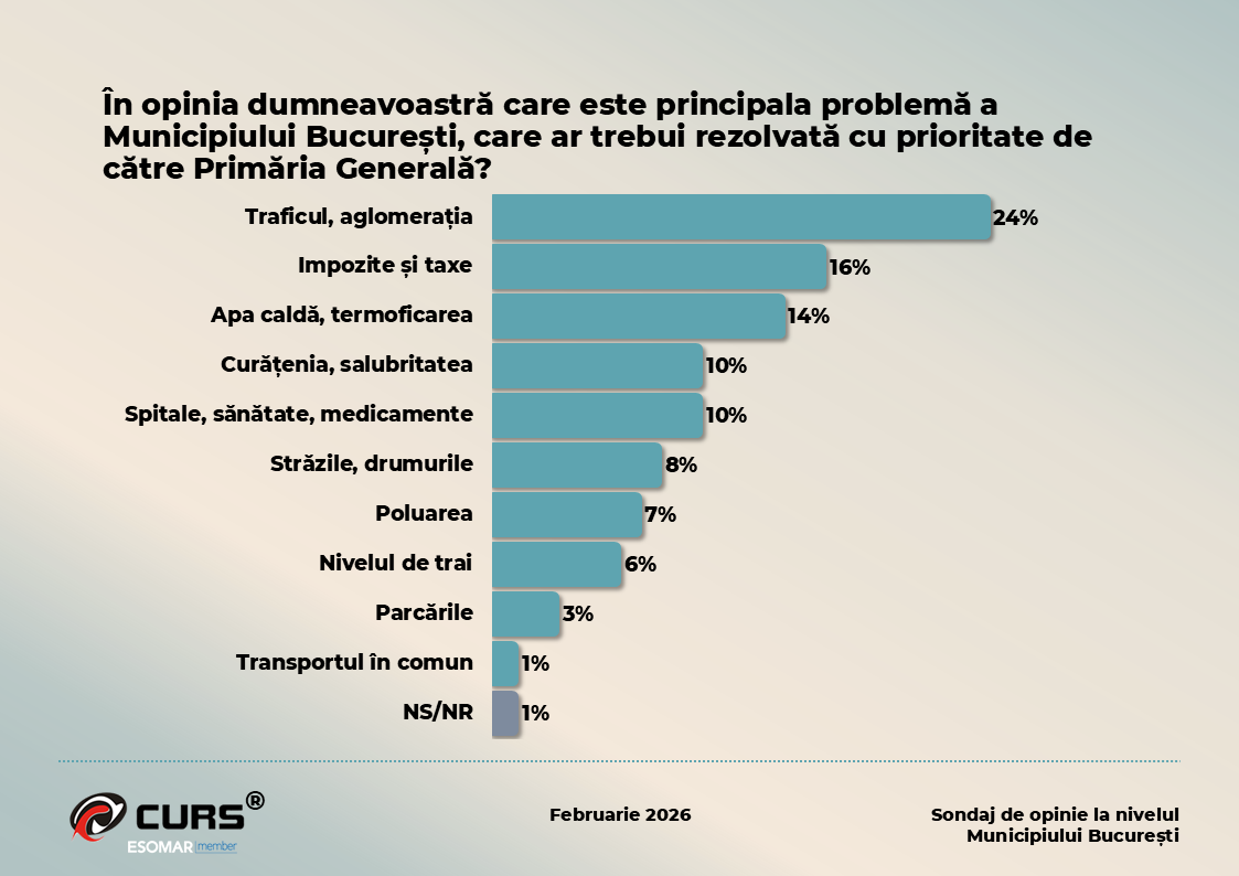 Întrebați care este principala problemă ce ar trebui rezolvată cu prioritate de Primăria Generală, bucureștenii indică în primul rând traficul și aglomerația, menționate de 24% dintre respondenții sondajului CURS.