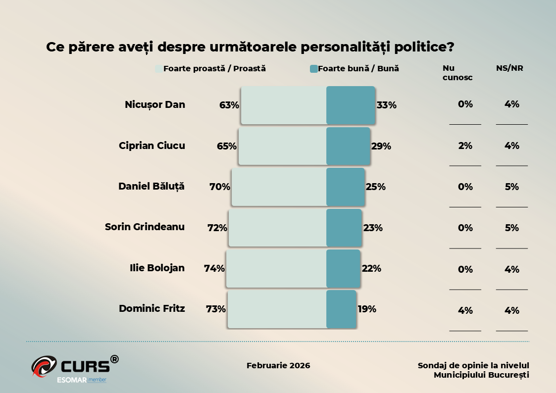 Potrivit datelor prezentate de CURS, evaluarea principalelor personalități politice indică niveluri ridicate de neîncredere. Președintele Nicușor Dan este evaluat pozitiv de 33% dintre respondenți, în timp ce 63% exprimă o opinie negativă.