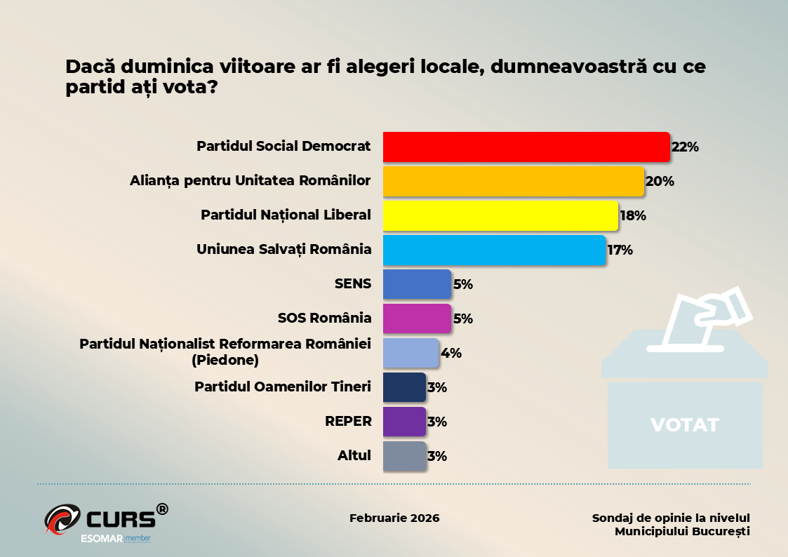 În ipoteza organizării unor alegeri locale duminica viitoare, PSD ar obține 22% din voturile bucureștenilor, fiind urmat de AUR cu 20%.