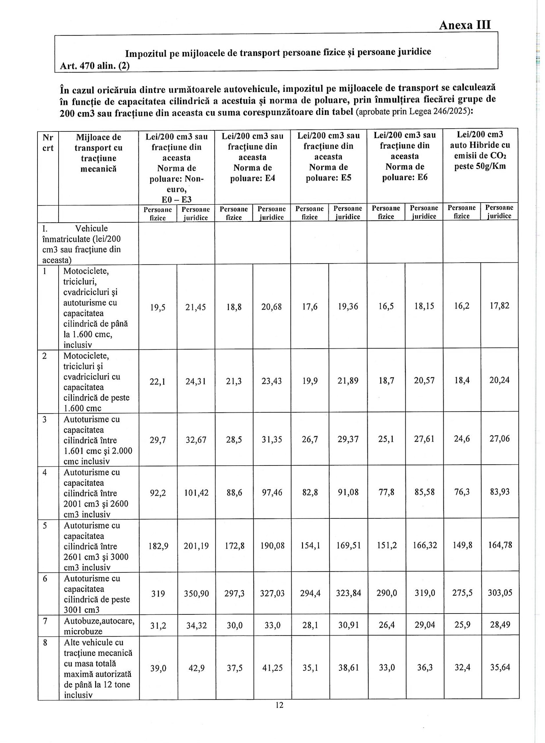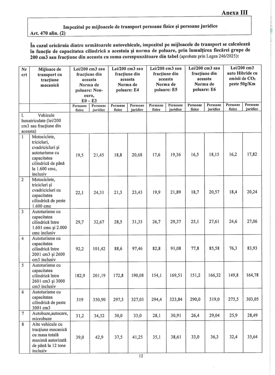 De exemplu, pentru o mașină de 1.600 cmc cu norma Euro 4, impozitul anual va fi de 150,4 lei, față de 96 de lei cât se plătea până acum. Pentru autoturisme sub Euro 4, suma crește la 156 de lei, iar pentru Euro 5 scade la 140,8 lei, respectiv 132 de lei pentru Euro 6. Mașinile hibride cu emisii peste 50 g/km vor avea un impozit de 129,6 lei.