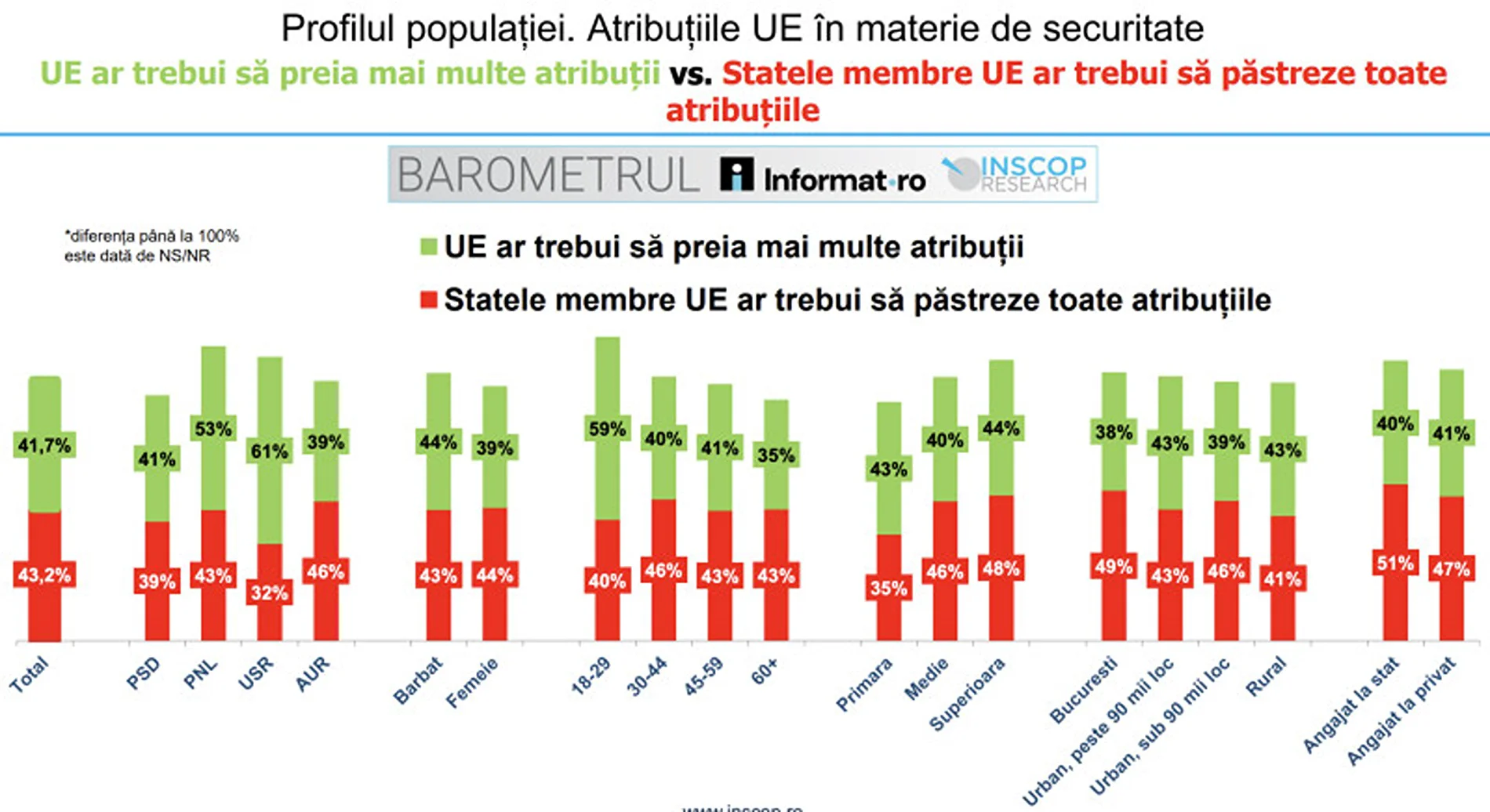 Un sondaj INSCOP indică un echilibru aproape perfect între cele două opțiuni majore. Pe de o parte, 41,7% dintre români susțin transferul unor atribuții de securitate și apărare către instituțiile europene, considerând că o abordare comună ar oferi mai multă protecție în fața unor amenințări militare. Pe de altă parte, 43,2% cred că statele membre trebuie să își păstreze integral controlul asupra deciziilor militare, inclusiv în situații de criză.