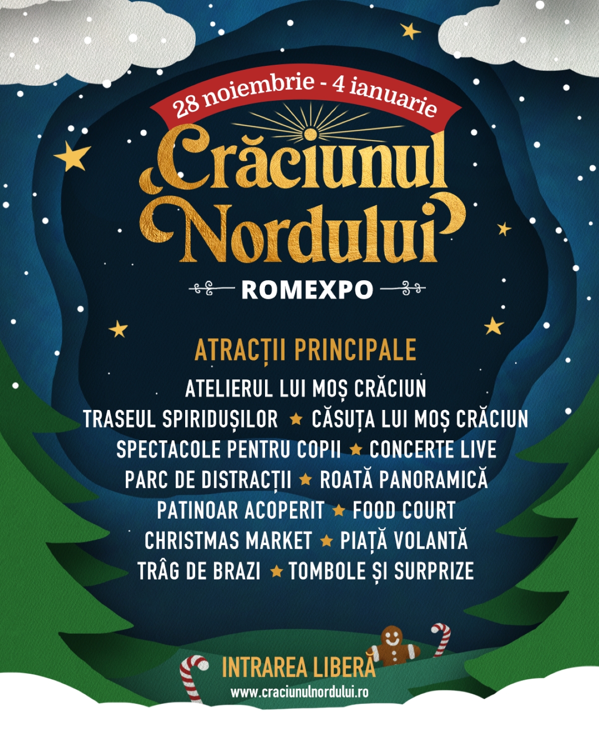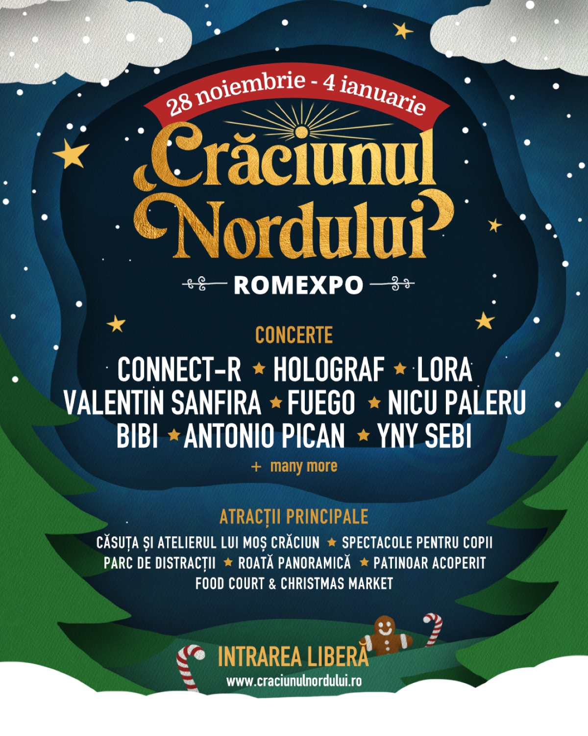 În fiecare seară, scena Crăciunului Nordului va găzdui spectacole muzicale variate, cu artiști precum Connect-R, Holograf, Lora, Valentin Sanfira, Fuego, Nicu Paleru, Bibi, Constantin Enceanu, Simona Nae, Nicola și Ducu Bertzi. De la colinde tradiționale și piese clasice de iarnă la concerte pop și folk, fiecare seară promite emoție și momente memorabile.