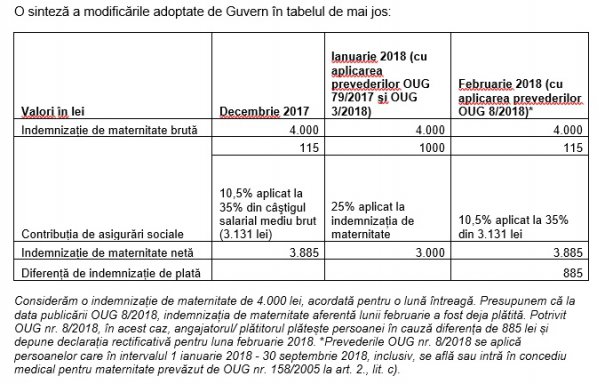 Măsurile care au dus la scăderea indemnizației de maternitate au fost creșterea cotei de contribuții de asigurări sociale la 25% și modificarea bazei de calcul al contribuției de asigurări sociale datorată de persoanele care beneficiază de concedii medicale de la 35% din salariul mediu brut la nivelul propriu zis al indemnizației de maternitate. Pentru a elimina aceste efecte negative ale Ordonanței de Urgență a Guvernului nr. 3/2018, alături de cele ale Ordonanței de Urgență a Guvernului nr. 79/2017, Guvernul a reintrodus formula de calcul al contribuției de asigurări sociale valabilă în luna decembrie 2017, respectiv 10,5% aplicat la 35% din 3.131 lei, (în total 115 lei), datorată pentru această indemnizație.
