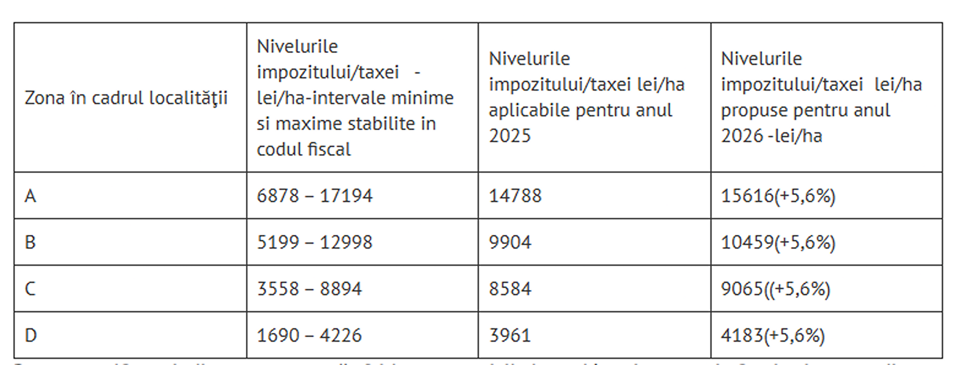 În ceea ce privește impozitul pe terenurile cu construcții în intravilan, ajustarea va fi realizată în conformitate cu rata inflației, ceea ce înseamnă o creștere medie de 5,6% față de nivelurile din 2025. Astfel, valorile aplicabile pentru 2026 sunt: