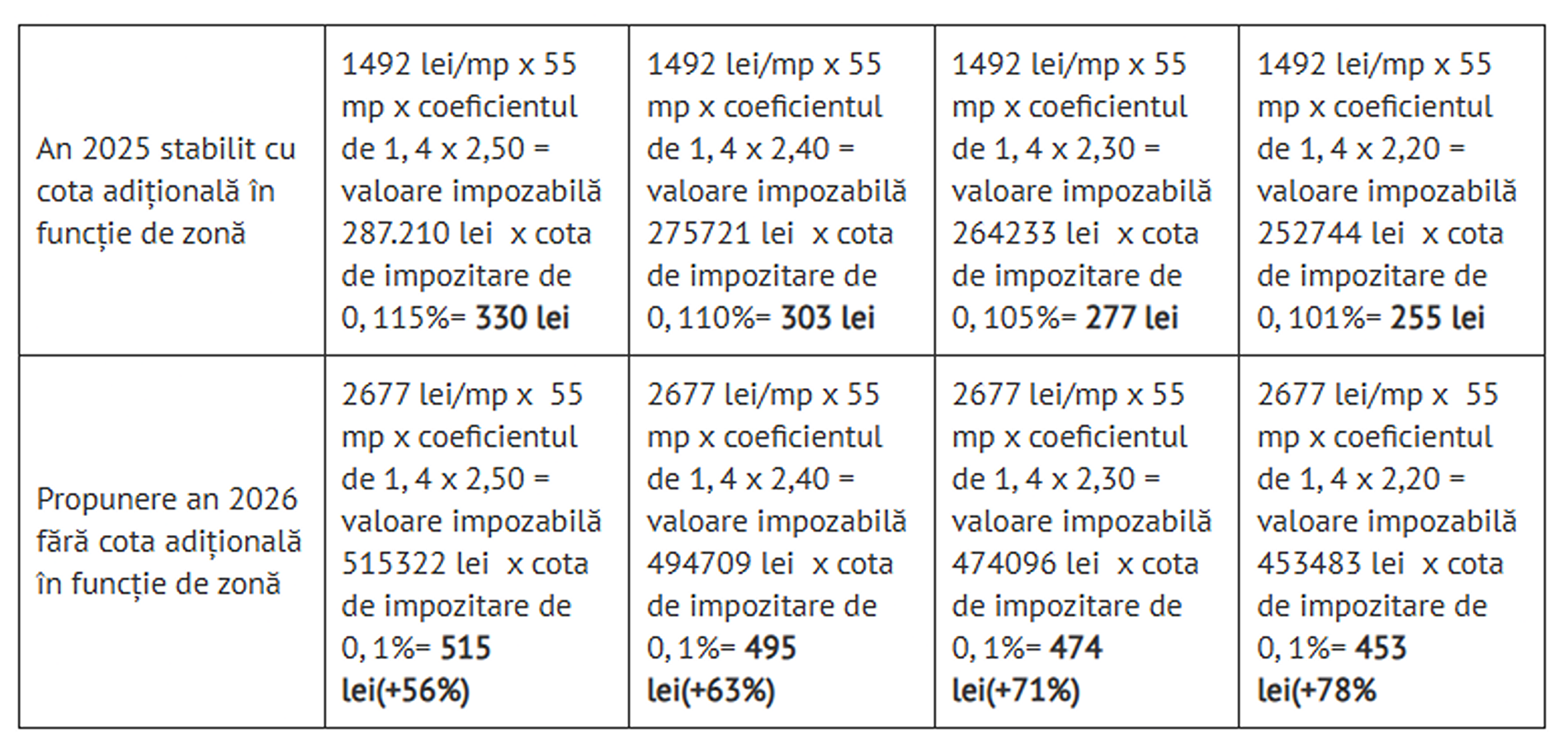 în zona A, impozitul crește de la 330 lei în 2025 la 515 lei în 2026;