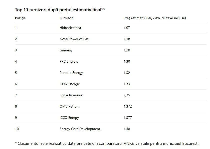 În acest context, clasamentul furnizorilor după prețul final pe kWh s-a modificat: Hidroelectrica își menține poziția de lider cu tariful cel mai mic, dar mari jucători, precum E.ON, Engie sau PPC, au reușit să reducă diferențele și să urce în ierarhie.